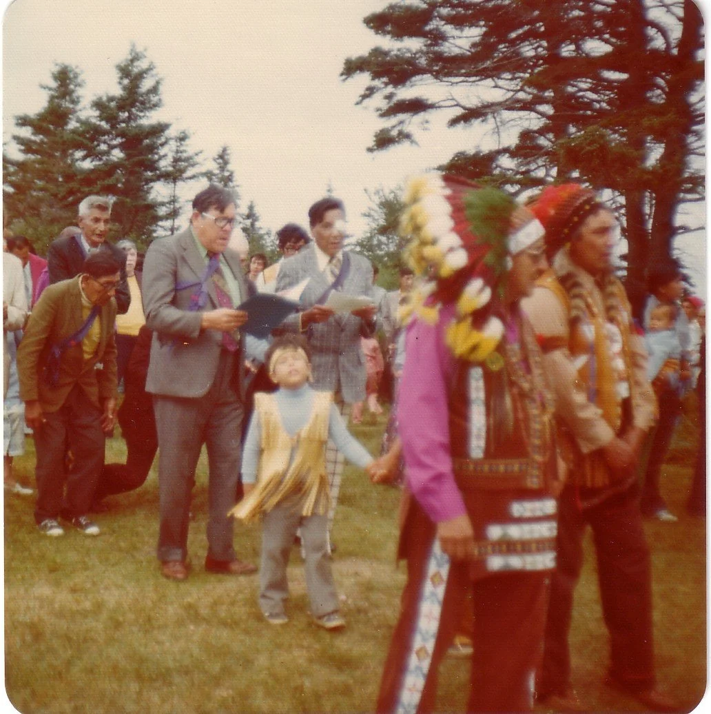“This Picture is probably from the 1970s, and is of the Elders’ choir in the Chapel Island Procession. The picture includes Noel (Gubble) Stevens (born in 1910) — wearing sneakers and a blue sash, Noel P. Denny behind him, Wilfred J. Prosper and beside my dad is Martin Dennis (my dad’s cousin in plaid). In the headdress, on the left, is Paul Stevens (purple shirt) and Noel R Denny”. - Kenny Prosper