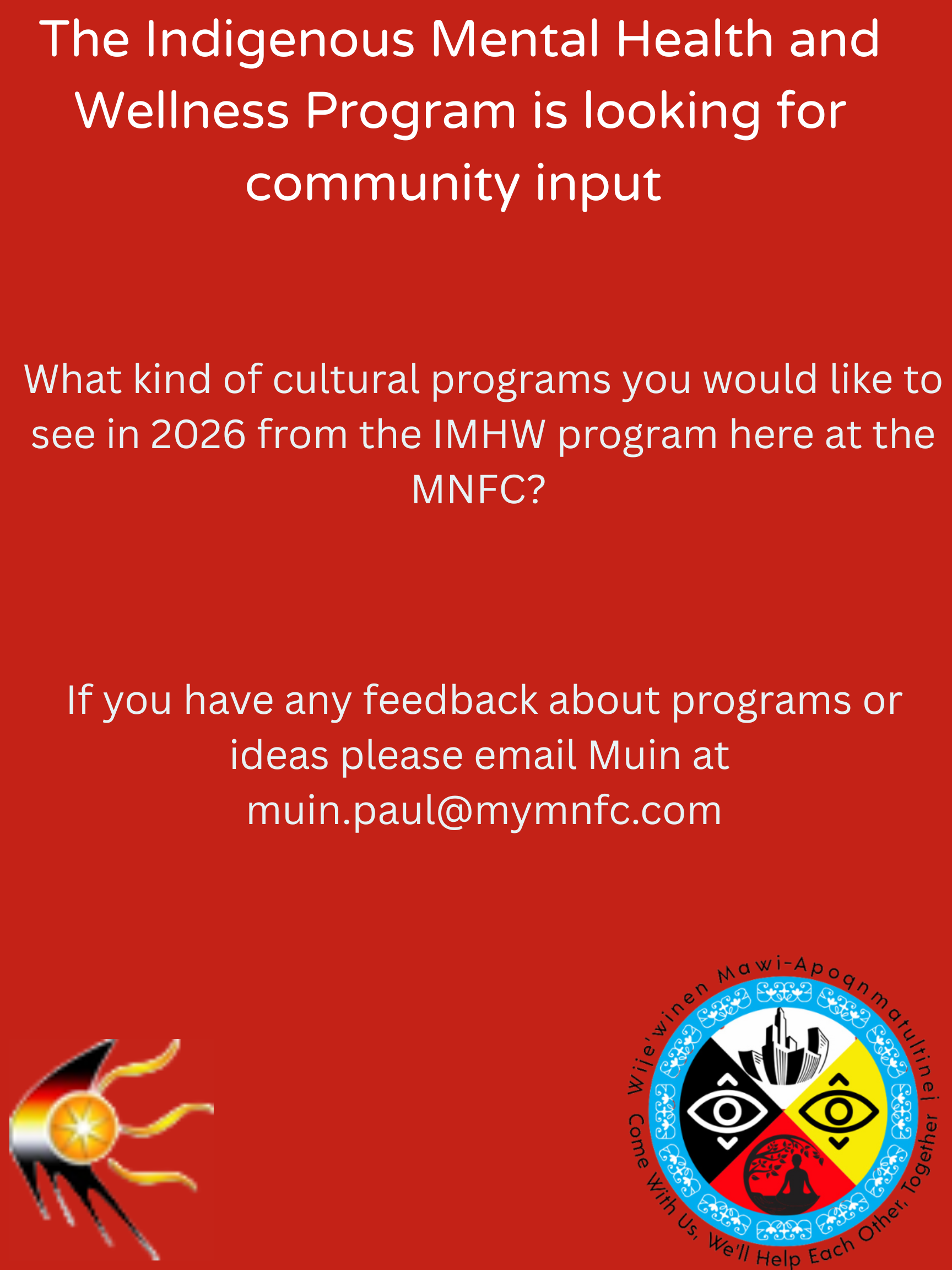 Our program prioritizes your safety and is led by clients, focusing on trauma-informed care. We take a comprehensive, culturally aware approach to mental wellness, considering all the factors affecting well-being. Services are easy to access, whether in person, by phone, or online. We provide one-on-one and group support for urban Indigenous community members aged 18 and older, as well as cultural programming for children and youth. We collaborate with other MNFC programs to offer full support to community members.