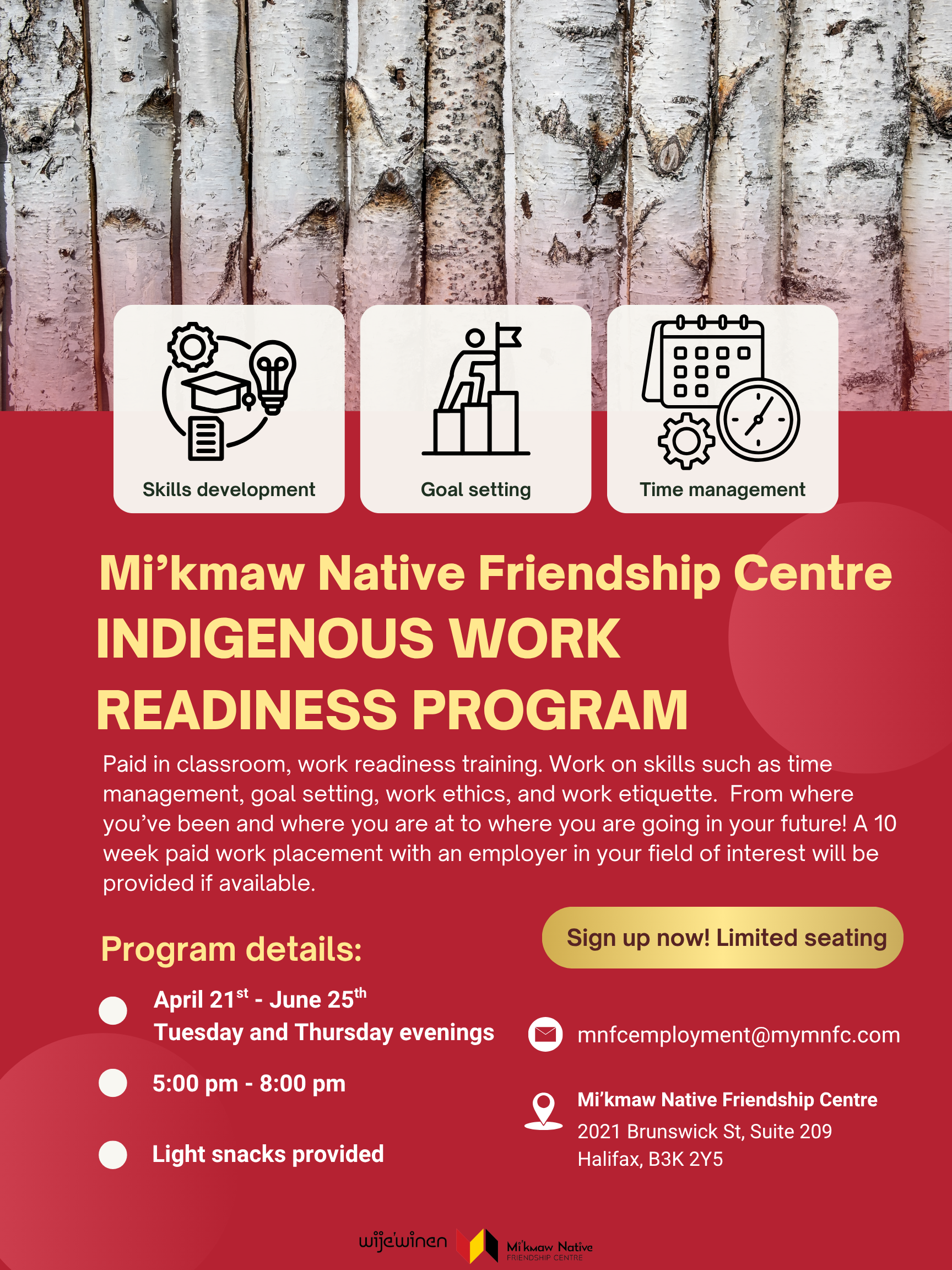Back to All Events Employment & Training: Indigenous Work Readiness Tuesday, May 5, 2026 5:00 p.m. 8:00 p.m. Mi'kmaw Native Friendship Centre 2021 Brunswick Street Halifax, NS, B3K 2Y5 Canada (map) Google Calendar ICS