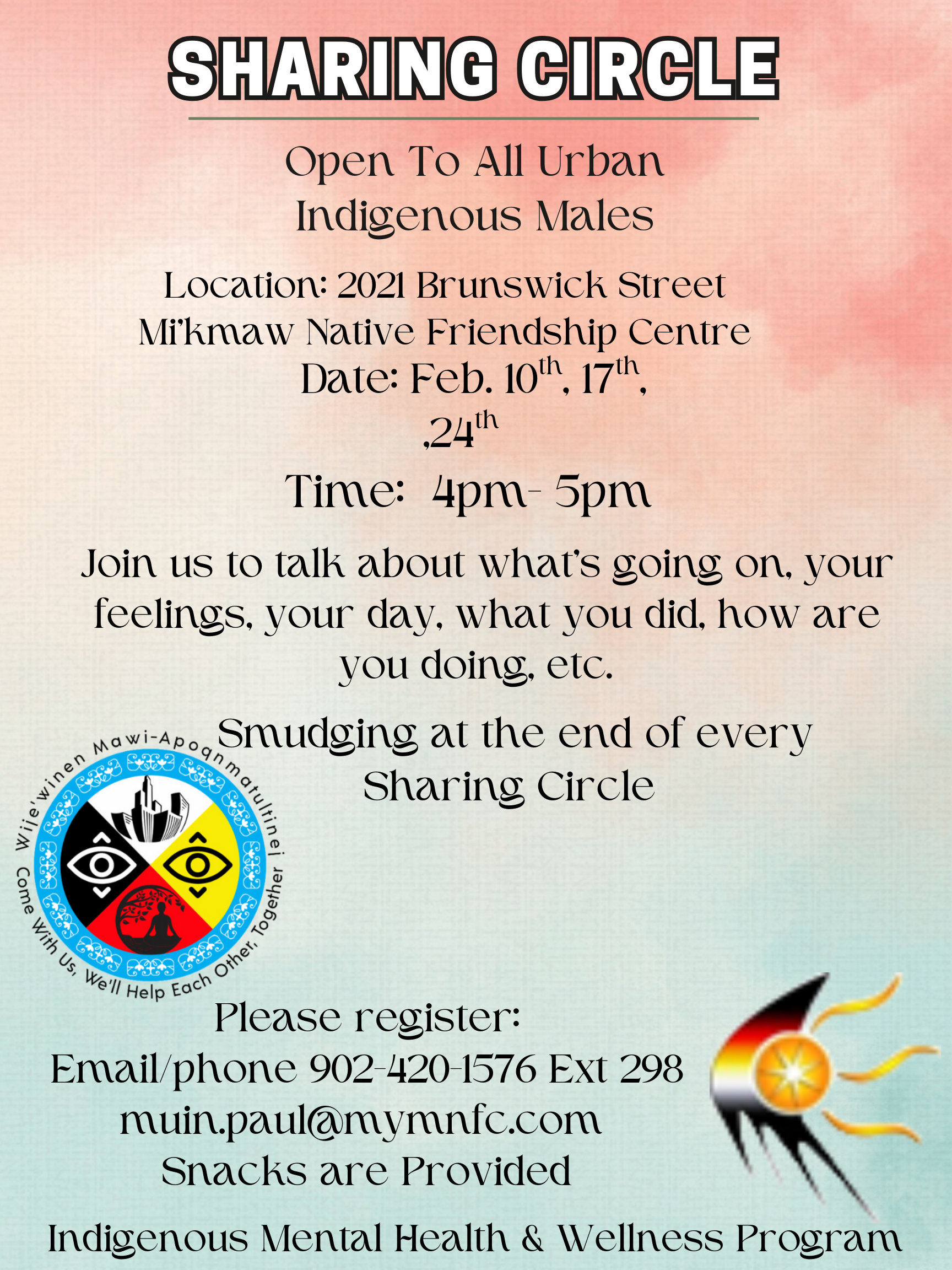 Back to All Events IMHW: Urban Indigenous Male Sharing Circle Tuesday, February 24, 2026 4:00 p.m. 5:00 p.m. Mi'kmaw Native Friendship Centre 2021 Brunswick Street Halifax, NS, B3K 2Y5 Canada (map) Google Calendar ICS Indigenous Mental Health and Wellness