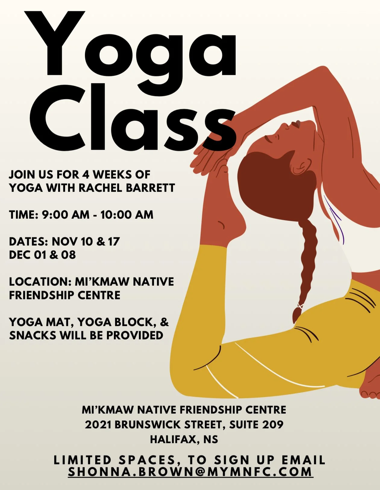 Back to All Events IMHW: Yoga Class with Rachel Barrett Monday, December 8, 2025 9:00 a.m. 10:00 a.m. Mi'kmaw Native Friendship Centre 2021 Brunswick Street Halifax, NS, B3K 2Y5 Canada (map) Google Calendar ICS Indigenous Mental Health and Wellness