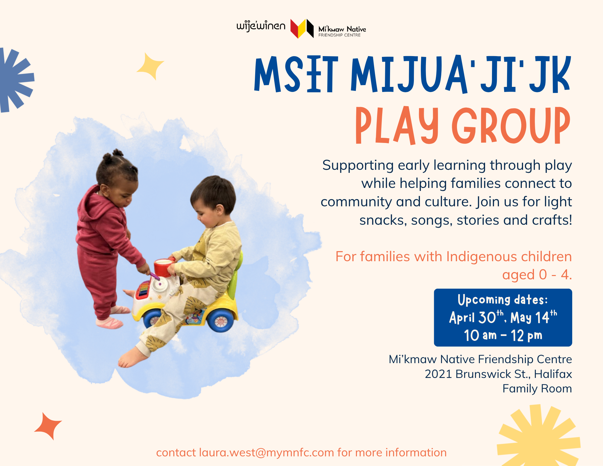 Back to All Events Msɨt Mijua'ji'jk: Play Group Thursday, May 14, 2026 10:00 a.m. 12:00 p.m. Mi'kmaw Native Friendship Centre 2021 Brunswick Street Halifax, NS, B3K 2Y5 Canada (map) Google Calendar ICS Msɨt Mijua'ji'jk