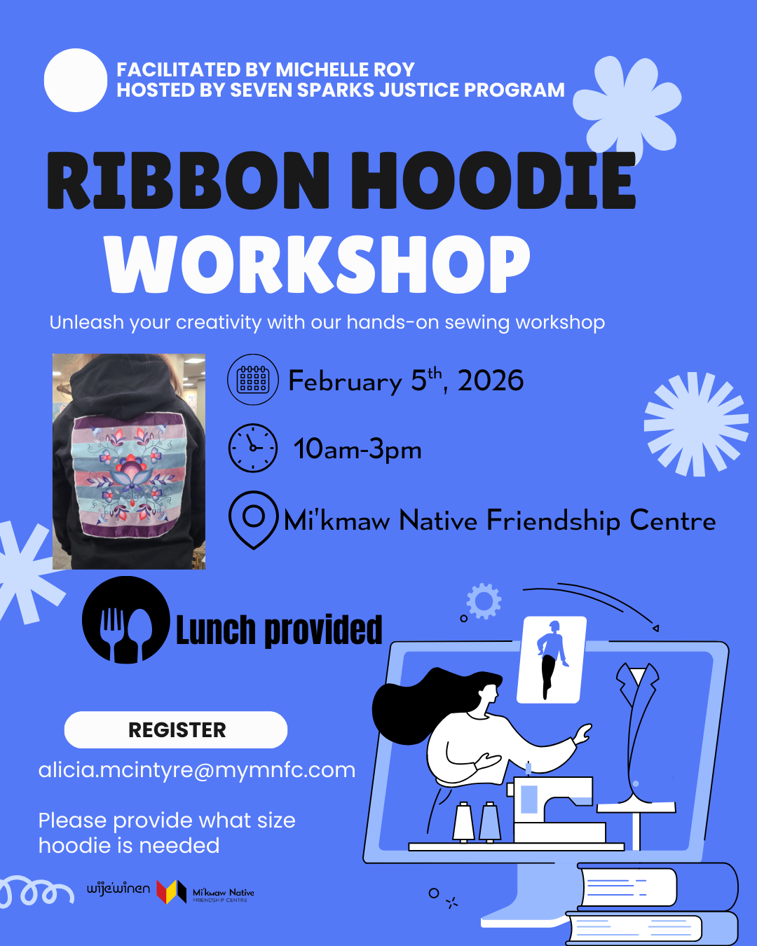 Back to All Events Seven Sparks: Ribbon Hoodie Workshop Thursday, February 5, 2026 10:00 a.m. 3:00 p.m. Mi'kmaw Native Friendship Centre 2021 Brunswick Street Halifax, NS, B3K 2Y5 Canada (map) Google Calendar ICS Seven Sparks Justice Program