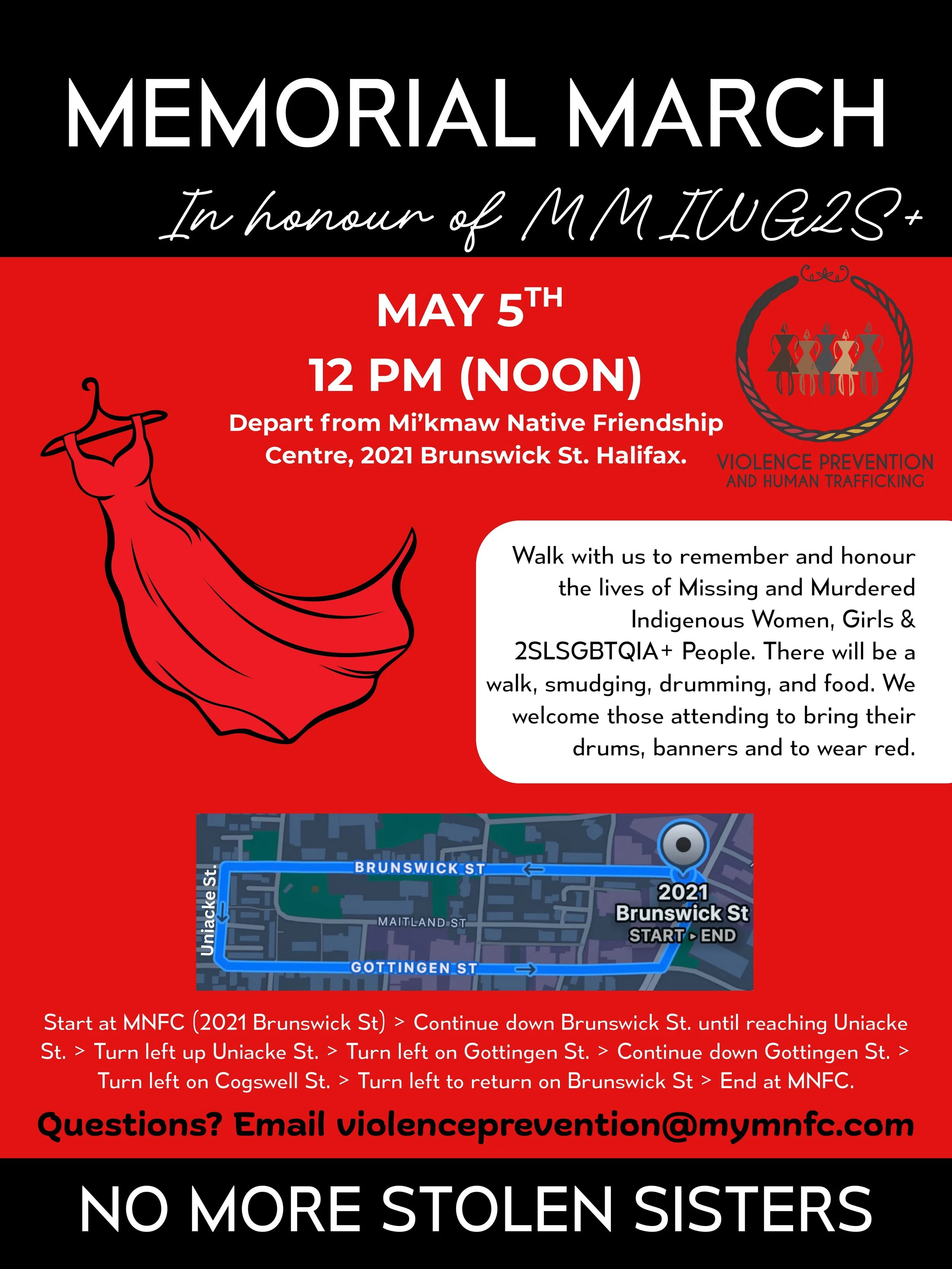 Back to All Events VPHT: Memorial March in Honour of MMIWG2S+ Tuesday, May 5, 2026 12:00 p.m. 2:30 p.m. Mi'kmaw Native Friendship Centre 2021 Brunswick Street Halifax, NS, B3K 2Y5 Canada (map) Google Calendar ICS