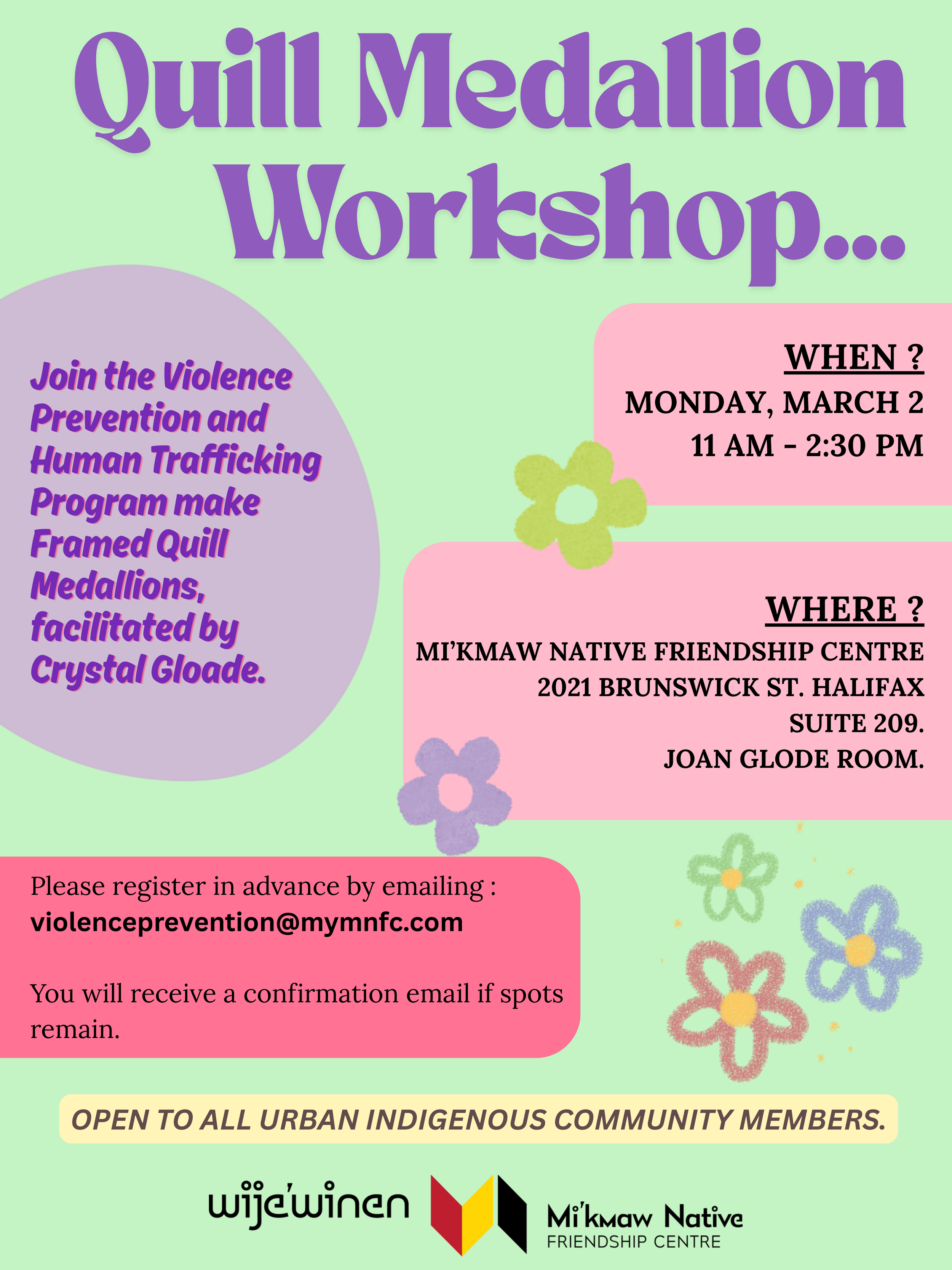 VPHT: Quill Medallion Workshop Monday, March 2, 2026 11:00 a.m. 2:30 p.m. Mi'kmaw Native Friendship Centre 2021 Brunswick Street Halifax, NS, B3K 2Y5 Canada (map) Google Calendar ICS Violence Prevention & Human Trafficking